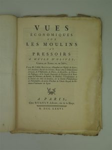 ROZIER L'ABBE, Vues économiques sur les moulins et pressoirs à huiles d'olives connus en France ou en Italie, Chez Ruault, Paris, 1776, in-4, 27 pages. Contient 7 planches relatives au mécanisme des moulins et pressoirs. Brochure, sur beau...