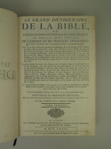 SIMON (Honoré) Le grand dictionnaire de la Bible ou explication littérale et historique de tous les mots propres de l'ancien et nouveau testament, Lyon, Pierre Bruyset Ponthus, 1768, in-folio. Reliure plein cuir marbré avec filets dorés sur les...