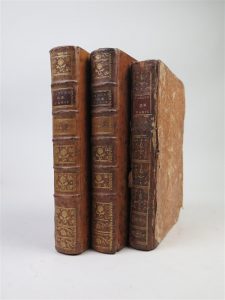 La reliure des tomes 5 et 7 est en veau d'époque, dos à 5 nerfs, caissons ornés de fleurons dorés, titre dans une pièce de cuir rouge, les tranches sont marbrées.