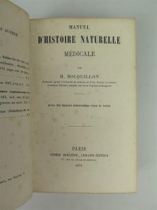 BOCQUILLON H., Manuel d'histoire naturelle médicale, Éditions Germer Baillière, Paris, 1871, in-12, 1268 pages en 2 volumes. Ouvrages ornés de 415 figures dans le texte.