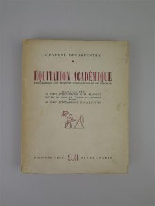 DECARPENTY, Équitation académique, Éditions Henri Neveu, Paris, 1949, in-4, 351 pages. Exemplaire n° 232/2100. Ouvrage illustré en noir par le chef d'escadrons GH Margot.