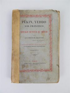 BEAUVOIR Comte de, Pékin Yeddo San Fransisco, voyage autour du monde, Éditions Plon, Paris, 1872, in-12, 360 pages. Ouvrage contenant quatre cartes et quinze gravures photographiques par Deschamps. Broché en mauvais état.