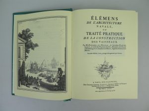 DUHAMEL DU MONCEAU, Elemens de l'architecture navale ou traité pratique de la construction des vaisseaux, 1994, in-4, 484 pages. Contient 23 planches dépliantes. Reliure tissu verte, dos lisse orné de fleurons dorés, écusson doré sur le...