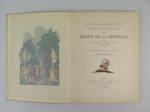 BRETONNE RESTIF DE LA, Les égarements sentimentaux, Éditions Crès et cie, Paris, 1921, in-8, 94 pages. Exemplaire n°1219/1500 sur vélin pur fil lafuma. Ouvrage illustré de 101 compositions de Joseph Hémard dont un frontispice en couleurs...