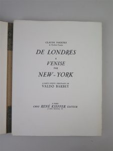 FARRERE CLAUDE DE, De Londres à Venise par New York, Éditions Kieffer, Paris, 1949, in-folio. Ouvrage illustré de 18 eaux fortes originales de Valdo Barbey sous serpentes.