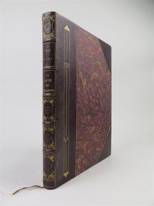 Reliure demi-chagrin à coins, premier plat papier marbré, dos à 5 nerfs, caissons ornés de filets et motifs dorés, titre et auteur en lettres dorées.
