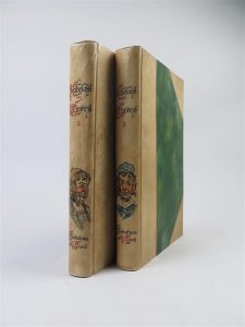 Demi-reliure à coins, plats papier vert, dos lisse illustré.
