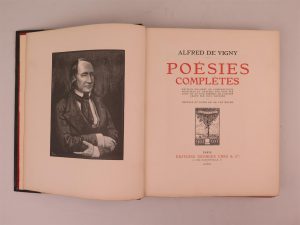 VIGNY ALFRED DE, Poésies complètes, Éditions Georges Crès et cie, Paris, 1920, in-4, 348 pages. Exemplaire n°393/848 sur vélin sur rives. Édition décorée de compositions dessinées et gravées sur bois par Louis Jou et d'un portrait de...
