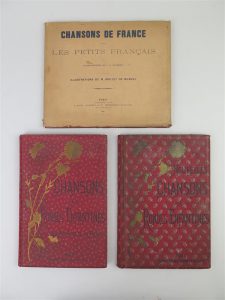 WECKERLIN JB, Chansons de France pour les petits français, Éditions Plon, 1885, in-4 oblong, 48 pages. Ouvrage illustré par MB de Monvel en couleurs. Reliure tissu fleuri, jaquette souple rempliée, nombreuses rousseurs.