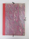 En feuilles, sous chemise papier marbré fermée par des lacets.