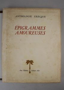 ANIEL JEAN PHILIPPE, Épigrammes amoureuses, Éditions du palmier d'or, Toulouse, Paris, 1948, in-4, 151 pages. Hors commerce d'un tirage à 550 exemplaires sur papier pur fil Johannot.