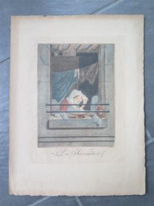 SAINT AUBIN AUGUSTIN DE, LA SAVONNEUSE, feuille : 29,5x39cm gravure : 17x23cm. Gravure en couleurs d'Augustin de St Aubin représentant une femme penchée dans son bac à la lessive laissant apparaître sa poitrine.
