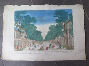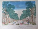 VUE D'OPTIQUE LES BOULVARD DE PARIS PRIS DU GRAND CAFFE PRES LE RESERVOIR DE LA VILLE, Imprimeur : Lachaussée rue St Jacques, Paris, feuille : 52x36,5 cm, gravure : 38x26,5 Gravure rehaussée de couleurs de la fin du XVIIIe, nombreux personnages...