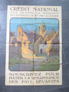 CRÉDIT NATIONAL POUR FACILITER LA RÉPARATION DES DOMMAGES CAUSÉS PAR LA GUERRE, 78x110cm. Très beau village de ruine par Constant Duval. Petites déchirures marginales et au centre d'un pli. Affiche réalisée par l'avenir publicité. Paris,...