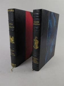 Demi reliure en cuir bleu à coins, plats papier marbré bleu, dos à 6 nerfs, fleurons dorés dans les caissons, tranche supérieure dorée, titre et auteur en lettres dorées.