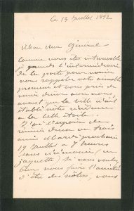 Il lui rappelle sa promesse de venir avant que la ville n’ait établi notre résidence à la belle étoile. J’ai l’espoir de réunir deux ou trois amis mardi prochain 19 juillet à 7 heures sans cérémonie (en jaquette) si vous voulez bien nous faire l’amitié d’être des nôtres.