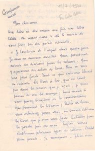 • A Georges Hugnet. Carcassonne, mardi (12 juillet 1940), 7 pages et 1/2 avec enveloppe . Belle lettre littéraire, évoquant l’achat et la reliure de livres et parlant de ses amis surréalistes. Il donne des nouvelles de René Nelli et de Suzette Ramon, en qui il croit vraiment, et énonce le principe qui guide sa collaboration aux revues littéraires. Il complimente longuement Hugnet pour le numéro 2 de L’Usage de la parole, heureux d’y avoir lu des textes de Dali, Leonora Carrington et des surréalistes belges comme Marien et Dumont.