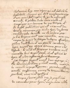 …L’ennemi qui étoit aux fauxbourgs et qui avoit fait replier la garde nationale a reculé, le plateau de la Croix Rousse est occupé par 400 hommes de nos troupes, et si le Général autrichien qui est en avant de Bourg n’emmène pas contre Lyon des forces nombreuses la ville de se rendra pas. […] le maréchal est toujours à Valence où il ramasse tout ce qu’il peut, il est estimé à Lyon et son influence fera beaucoup ».