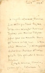 Chateaubriand regrette de n’avoir pu être présenté à M. Hodgson lors de leurs dernières visites; Je regrette infiniment, (…) de ne m’être pas trouvé chez moi (…). Je pars pour une nouvelle course qui durera 10 à 12 jours.