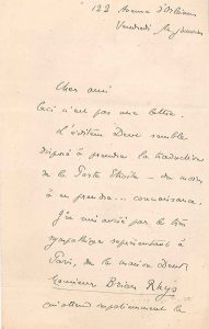 …L’éditeur Dent semble disposé à prendre la traduction de la Porte Etroite – du moins à en prendre… connaissance. Le très sympathique Bryan Rhys, représentant de cette maison d’édition à Paris, en attend la dactylographie et Gide demande à son correspondant de lui faire tenir l’unique exemplaire que je vous ai confié – et autant que possible de le lui remettre de la main à la main (ou en tout cas de lui déposer pour lui 33 quai des Grands Augustins où je crois que vous le trouverez tous les matins)…*