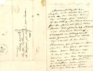 Adèle HUGO. 1803-1868. Épouse de Victor Hugo. L.A.S. à Félix Avril, chez M. Guilleminault (...). S.l., ce 8 (août 1831). 2 pp. bi-feuillet in-12, adresse au verso, marques postales.
