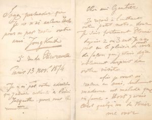 Johan-Barthold JONGKIND. 1819-1891. Artiste peintre néerlandais, précurseur de l’impressionnisme. L.A.S. à son ami Gautier. Paris, 13 novembre 1874. 4 pp. bi-feuillet in-8.