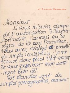 L’écrivain est non seulement blessé par le manque de courtoisie de son correspondant qui ne lui a pas demandé son autorisation mais aussi par cette réalisation même : « Vos planches sont de simples pornographies, monsieur. Je rougis de penser qu’elles ont pu être inspirées par mon livre et je vais demander à un avocat si la loi me permet de poursuivre à l’effet d’interdire la vente et l’exposition d’une œuvre qui me déconsidère ».