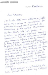 Lettre politique de Mitterrand alors nommé président de la Fédération de la Gauche au lendemain de ses bons résultats face à De Gaulle ; il répond aux critiques de l’artiste sur la stratégie du parti socialiste pour les prochaines élections : (…)