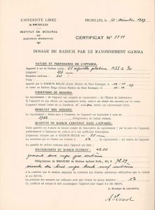 Certificat émanant de l'Institut de mesures par substances radioactives, délivrant le dosage de radium par le rayonnement gamma dans un appareil à sel de radium solide, apporté par l'Union minière du Haut Katanga (Congo belge).