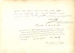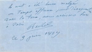 •un billet indiquant son arrivée à Paris pour la vente de ses affaires en août ; La nuit a été bonne malgré un temps affreux (...)