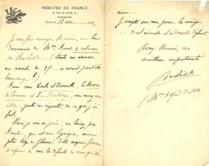 Marguerite Eymery dite RACHILDE. 1860-1953. Femme de lettres, épouse d'Alfred Valette. L.A.S. Paris, 18 novembre 1912. 2 pp. bi-feuillet in-8, en-tête du Mercure de France.