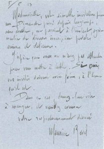 Maurice RAVEL (1875-1937). Compositeur. L.A.S. à Mlle Georgette Burgain. 5/5/[19]13. 1 page in-12.