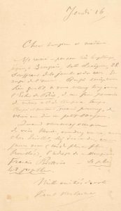 Verlaine fait part de son séjour à Broussais ; Me revoici – pas pour très longtemps, j’espère, à Broussais (…) souffrant de la jambe et du cœur. Et aussi de l’ennui. Aussi seriez-vous bien gentil, si vous recevez toujours l’Echo de Paris, de me faire parvenir de vieux n° de temps en temps. Aussi et surtout, quand pourrez-vous venir me dire un petit bonjour (…). Verlaine le prie enfin avec insistance de passer voir Vanier avec qui il est de plus en plus brouillé, pour lui demander, sans le mentionner, l’adresse de Francis Poictevin « le plus tôt possible ».