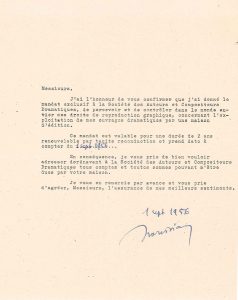 Cédant ses droits d’auteur : J'ai l'honneur de vous confirmer que j’ai donné le mandat exclusif à la Société des Auteurs et Compositeurs Dramatiques, de percevoir et de contrôler dans le monde entier mes droits de reproduction graphique, concernant l'exploitation de mes ouvrages dramatiques par une maison d’édition. Ce mandat est valable pour une durée- de 2 ans renouvelable par tacite reconduction et prend acte à compter du 1 sept 1956 (…).