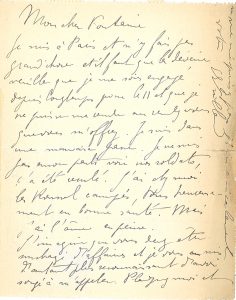 Je suis dans une mauvais passe. Je ne suis pas encore parti voir nos soldats. Ça [a] été reculé. J’ai chez moi les Roussel [la sœur de Vuillard avait épousé le peintre Ker-Xavier Roussel, ami proche de Vuillard] campés, tous heureusement en bonne santé. Mais j’ai l’âme en peine. J’imagine que vous devez être surchargé d’affaires et je vous en suis d’autant plus reconnaissance d’avoir songé à m’appeler. Plaignez-moi et ne me méprisez pas…