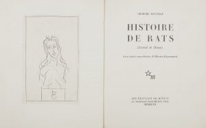 BATAILLE (Georges) - GIACOMETTI (Alberto). Histoire de rats (Journal de Dianus). Paris : Les Éditions de Minuit, 1947. - In-8, 201 x 164 : frontispice, 105 pp., (3 ff. 2 derniers blancs), 2 planches, couverture imprimée. Broché, couverture...