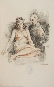 plats et le dos, dos lisse, encadrement de maroquin grenat à l'intérieur, orné de filets dorés, doublures et gardes de soie moirée bleue nuit, doubles gardes, tranches dorées sur témoins, couverture et dos conservés, étui (Yseux Sr de Simier).{CR}{CR}Édition tirée à 417 exemplaires, illustrée de 15 eaux-fortes originales d'Alméry LOBEL-RICHE (1877-1950).{CR}Un des 200 exemplaires sur vélin d'Arches contenant 2 états des illustrations, avec et sans remarques. Il est enrichi d'un envoi autographe de l'illustrateur adressé à Georges Collet ainsi que de 2 DESSINS ORIGINAUX ÉROTIQUES DE L'ARTISTE.{CR}Bel exemplaire relié par Yseux, malgré des traces de frottements sur les bords supérieurs et inférieurs des plats.{CR}Provenances : Georges Collet, avec ex-libris et dédicace de l'artiste. - Bibliothèque Collet de Montbozon, avec cachet humide sous la dédicace, sur le titre, la justification et les dessins.