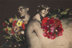 lequel est incorporée une médaille en bronze doré, gravée et sculptée.{CR}{CR}Édition tirée à seulement 90 exemplaires contenant chacun 8 compositions hors texte en couleurs de l'artiste peintre Michèle SALMON (née en 1946), chacune étant une épreuve unique entièrement peinte à la main par l'artiste sur un fond lithographique monochrome.{CR}Chaque exemplaire possède également une médaille en bronze doré, gravée et sculptée par Michèle Salmon, incorporée dans l'emboîtage.{CR}Envoi de l'artiste à monsieur Laporte, figurant au verso de la justification.{CR}Exemplaire très bien conservé.