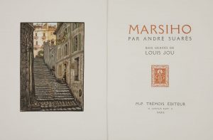 SUARÈS (André) - JOU (Louis).{CR}Marsiho.{CR}Paris : M.-P. Trémois, [1931]. - In-8, 271 x 212 : frontispice, 169 pp., (4 ff. dernier blanc), 5 planches, couverture illustrée. Broché, couverture rempliée, chemise et étui...