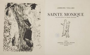 VOLLARD (Ambroise).{CR}Sainte Monique.{CR}Paris : Ambroise Vollard, 1930. - In-4, 321 x 246 : frontispice, (3 ff. premier blanc), IX, 222 pp., (4 ff.), XV ff., (3 ff.), 45 planches, couverture illustrée. En feuilles, couverture...