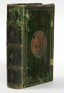 In-12, vélin vert à petits recouvrements, filets et fine roulette dentelée dorés encadrant les plats, fleur de lys aux angles, armoiries au centre, dos lisse orné, traces de lacs de soie (reliure de l’époque).