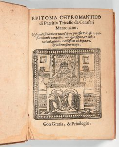 [CHIROMANCIE]. TRICASSO da CERASARI (Patrizio). Epitoma chyromantico […]. [Au colophon :] Stampato in Venetia per Agostino de Bindoni, 1538. In-12, vélin cendré, dos à nerfs (reliure du XVIIIe s.).