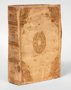 doré encadrant les plats, large fleuron aux angles, motif ovale au centre, dos orné avec titre à l’encre, tranches dorées (reliure de l’époque).
