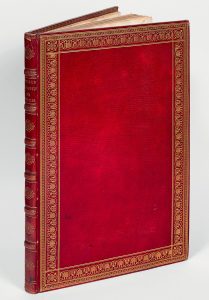 rouge, triple filet doré encadrant les plats, fleuron aux angles, armoiries au petits fers au centre, dos lisse orné, pièce de titre en maroquin vert, tranches dorées (reliure de l’époque).