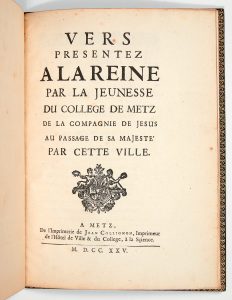 [METZ]. Vers presentez a la Reine par la jeunesse du College de Metz de la Compagnie de Jesus au passage de Sa Majesté par cette ville. À Metz, De l’Imprimerie de Jean Collignon, 1725. In-8° carré, maroquin vert, triple filet doré...