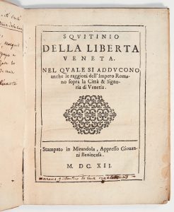 [VENISE – WELSER (Marcus)]. Squitinio della liberta veneta. Nel quale si adducono anche le raggioni dell’Impero Romano sopra la Città & Signoria di Venetia. Stampato in Mirandola, Appresso Giovanni Benincasa, M. DC. XII [1612]. Petit in-8°...