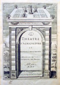 Edition originale extrêmement rare. Elle est ornée d’un titre gravé par Mallery, surmonté d’un petit portrait en pied du Roi Henri IV, de 8 vignettes gravées sur bois et de figures sur bois dans le texte montrant les plans du jardin médicinal. C’EST LE PREMIER LIVRE FRANÇAIS CONSACRE A L’AGRICULTURE ; il bénéficia d’un extraordinaire succès pendant 3 siècles. Il témoigne du relèvement agricole de la France après les évènements des guerres de religion et Olivier de Serres y introduit des notions alors nouvelles : La jachère, la nécessité du défoncement profond de la terre, la distinction des plantes épuisantes, le fondement de la théorie des assolements. Il recommande le soufrage des vignes et préconise des cultures nouvelles. Le houblon, le maïs, le riz, la betterave, récemment importée et dont il signale que le jus est « semblable à un sirop de sucre ». La prose d’Olivier de Serres est pleine de charme et Henri IV s’en faisait lire un passage chaque jour. Exemplaire d’une grande fraicheur intérieure avec ses marges d’origine. Le dos manque ainsi qu’une partie du décor du premier plat. (En français dans le texte n° 79)