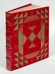 LOUŸS (Pierre). Les Aventures du Roi Pausole. Monte-Carlo, Éditions du Livre, s. d. [1945]. In-4°, maroquin rouge, plats entièrement ornés d’un décor géométrique doré et mosaïqué de maroquin vert, dos à nerfs orné du même décor,...