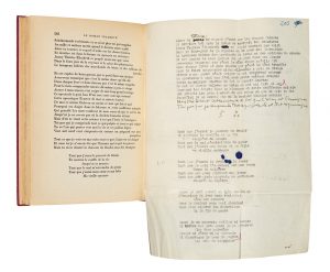 •deux pages in-4, l'une à l'encre bleue, l'autre tapuscrite avec ajouts autographes, manuscrits de premier jet de poèmes publiés dans ce recueil (pages 242-243)