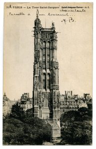 BRETON André. LA TOUR SAINT JACQUES. CARTE POSTALE LÉGENDÉE ET SIGNÉE. La légende de la carte postale représentant la Tour Saint Jacques chère à André Breton a été raturée et annotée par lui: A Paris - La Tour Saint Jacques chancelante....